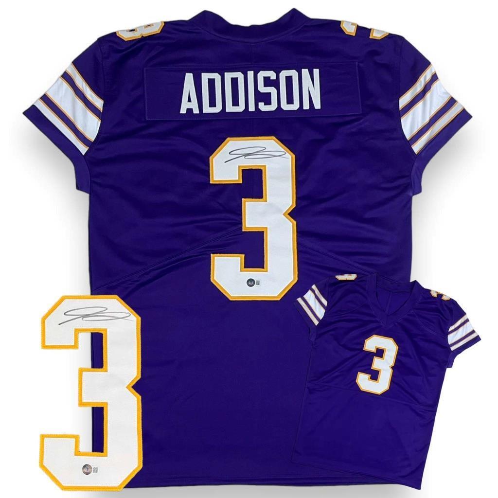 This signed item is brand new without tags or logos. This jersey is a size Large / XL. All letters and numbers are sewn on. This item will make a great gift or a great addition to any collection at an AFFORDABLE PRICE! ATHLETE: Jordan Addison ITEM: Game Cut Style Custom Jersey AUTHENTICATION: This item comes with a Beckett serial #'ed hologram affixed to the item. To ensure authenticity, the hologram can be reviewed online. This process helps to ensure that the product purchased is authentic and eliminates any possibility of duplication or fraud. NOTE: All of our autographed jerseys are custom jerseys, unless otherwise noted. Our custom jerseys are NON-BRANDED, have NO logos, NO tags, NO patches, NO emblems. Sewn letters and numbers. The non-branded jerseys are made specifically for the player(s) to sign, for collectible purposes.
