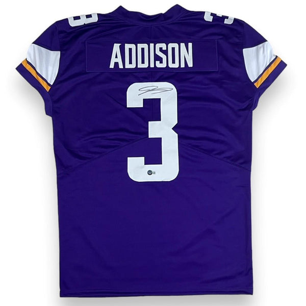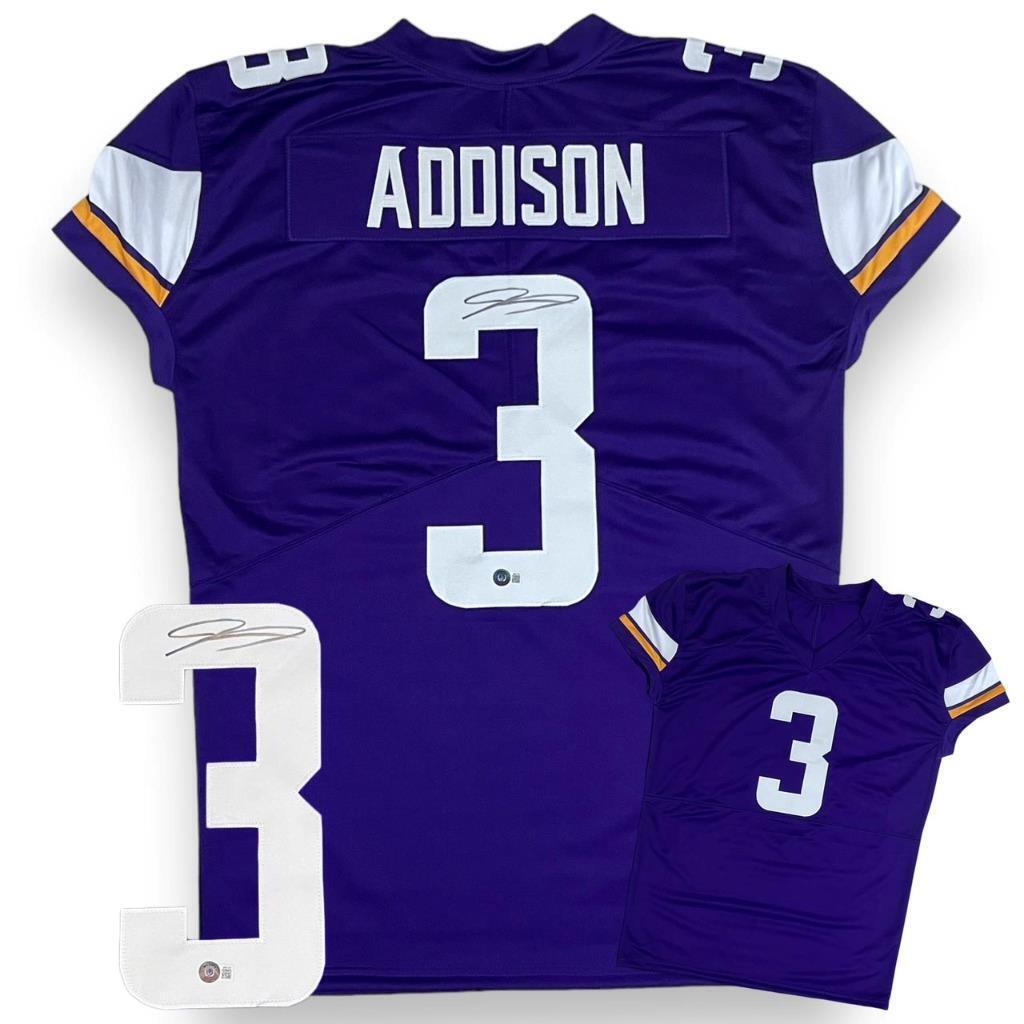 This signed item is brand new without tags or logos. This jersey is a size Large / XL. All letters and numbers are sewn on. This item will make a great gift or a great addition to any collection at an AFFORDABLE PRICE! ATHLETE: Jordan Addison ITEM: Game Cut Style Custom Jersey AUTHENTICATION: This item comes with a Beckett serial #'ed hologram affixed to the item. To ensure authenticity, the hologram can be reviewed online. This process helps to ensure that the product purchased is authentic and eliminates any possibility of duplication or fraud. NOTE: All of our autographed jerseys are custom jerseys, unless otherwise noted. Our custom jerseys are NON-BRANDED, have NO logos, NO tags, NO patches, NO emblems. Sewn letters and numbers. The non-branded jerseys are made specifically for the player(s) to sign, for collectible purposes.