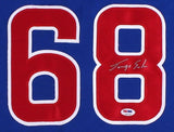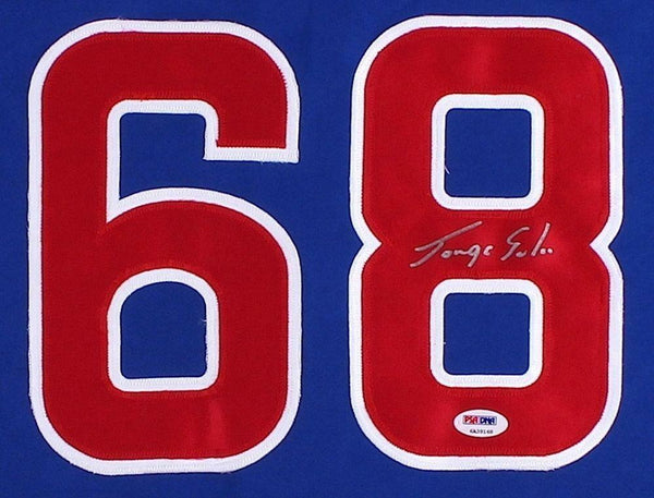 Custom on-field style jersey. Everything sewn on, size XL. Hand-signed in silver paint pen by Jorge Soler. The autograph includes an official PSA/DNA hologram and matching COA for authenticity purposes.