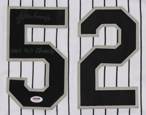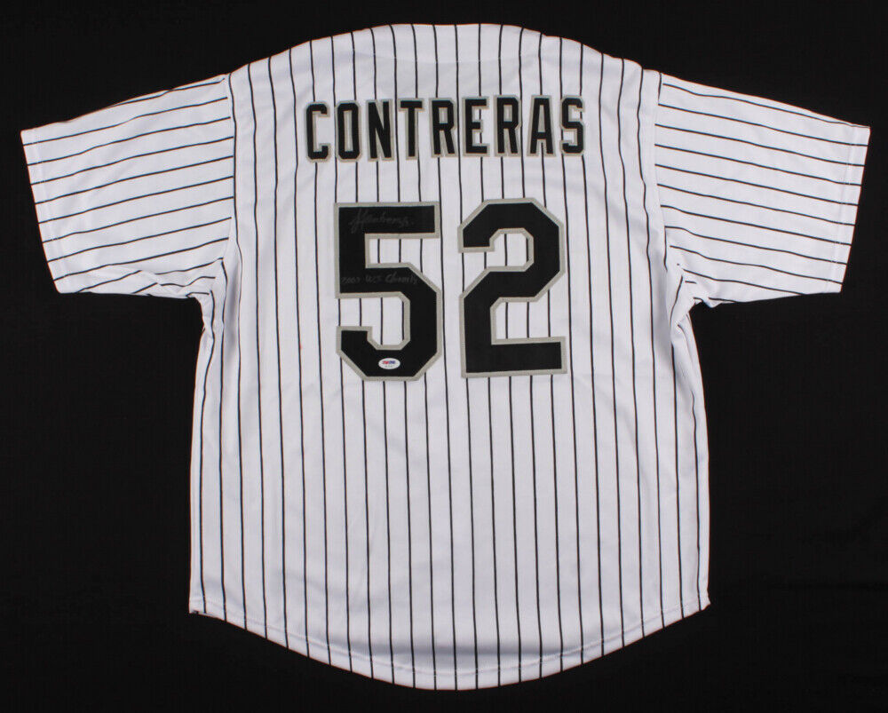 Custom on-field style jersey. Everything sewn on, size XL. Hand-signed in silver paint pen by Jose Contreras. The lot / autograph(s) includes an official PSA/DNA hologram and matching COA for authenticity purposes.Authentication: PSA COA