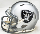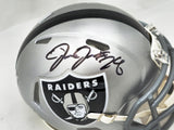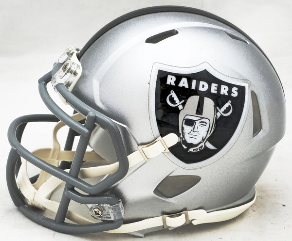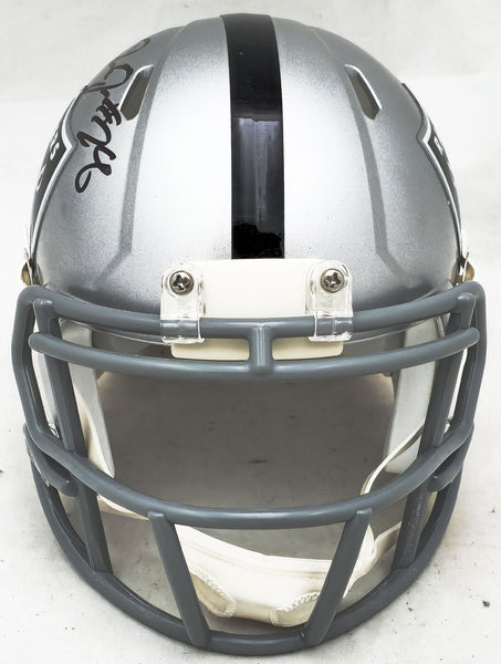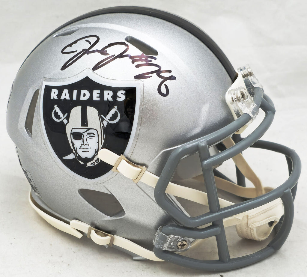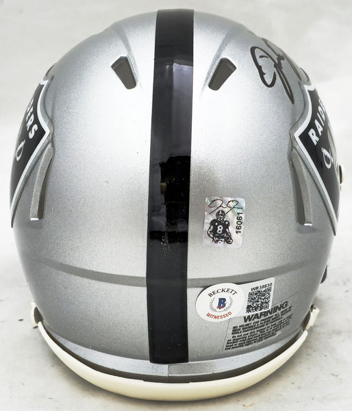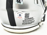 This is a Las Vegas Raiders Silver Speed Mini Helmet that has been hand signed by Josh Jacobs. This item has been certified authentic by Beckett Authentication (BAS) and comes with their tamper-proof QR Code hologram that can be verified on the Beckett-authentication.com.