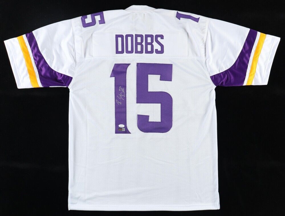 Custom on-field style jersey. Everything sewn on, size XL. Hand-signed in silver paint pen by Joshua Dobbs. The lot / autograph(s) includes an official James Spence Authentication (JSA) hologram and QR Code card for authenticity purposes.Authentication: JSA Hologram & QR Code card