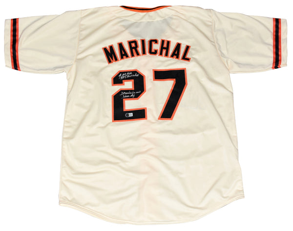 Juan Marichal, former Hall of Fame pitcher for the San Francisco Giants, has hand signed this custom baseball jersey. He included the inscription "Dominican Dandy" with his signature. Jersey is size XL and everything is sewn-on. This item is authenticated by Beckett Authentication Services and was signed in the presence of one of their representatives. Their tamper-evident hologram featuring a QR code and serial number is on the item. The authenticity can be verified online by entering the serial number or scanning the QR code.Item pictured may not be the exact item you will receive. It will be similar quality, and we guarantee your satisfaction.