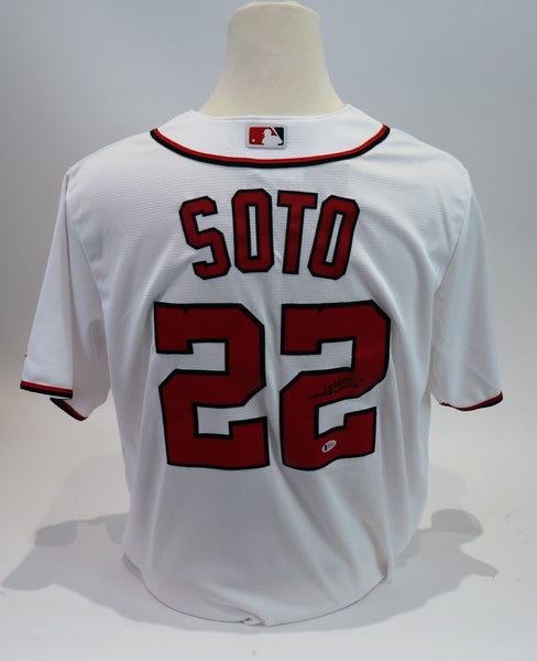 Embrace the thrill of the game with this authentic Juan Soto autographed Washington Nationals Majestic jersey, a coveted gem for any baseball enthusiast or devoted Nationals fan. As one of the brightest young stars in MLB, Soto's signature adds unparalleled value and prestige to this collector's item. Each signature is meticulously authenticated, ensuring its genuineness and preserving its long-term worth. Whether you're cheering on the Nationals from the stands or admiring Soto's remarkable talent, this jersey is a standout addition to your collection. Display it proudly in your home, office, or fan cave, and let it serve as a timeless tribute to the rising legacy of Juan Soto. Don't miss out - secure your piece of baseball history today
