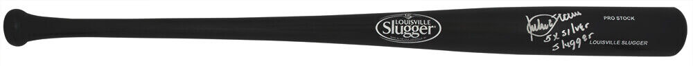 Julio Franco signed Louisville Slugger Pro Stock black baseball bat with '5x Silver Slugger' inscription. Item comes with a Schwartz Sports Memorabilia tamper-proof numbered hologram and Certificate of Authenticity which can be verified online.