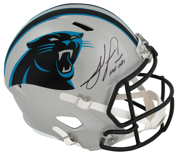 Julius Peppers signed Carolina Panthers Riddell full size speed replica helmet with 'HOF 2024' inscription. Item comes with a Schwartz Sports Memorabilia tamper-proof numbered hologram and Certificate of Authenticity which can be verified online.