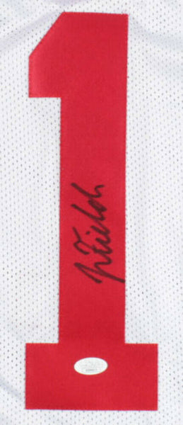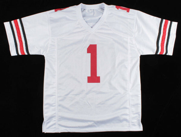 Custom on-field style jersey. Everything sewn on, size XL. Has been hand-signed by Justin Fields.The autograph(s) includes an official James Spence Authentication (JSA) "Signature Debut" hologram and COA. "Signature Debut" is the autographed memorabilia equivalent to a rookie card. The JSA definition of a "Signature Debut" is as follows: "Any item that is autographed and received by JSA prior to the last game of the signer's official rookie season.Authentication: JSA COA