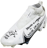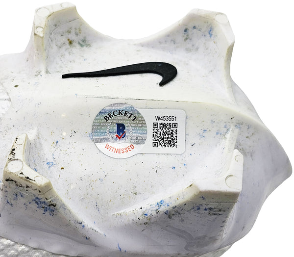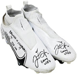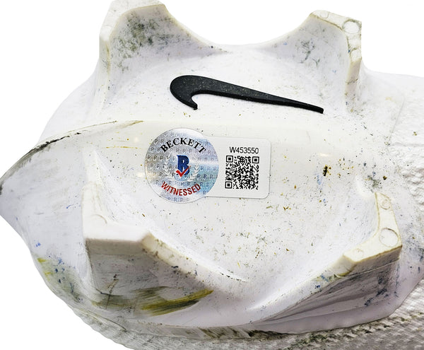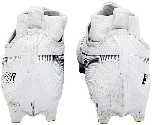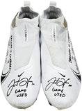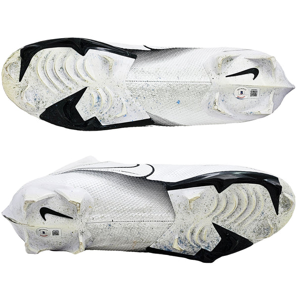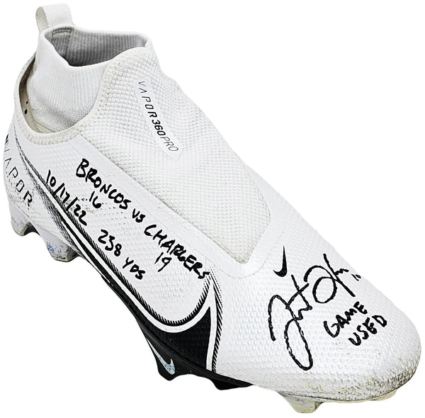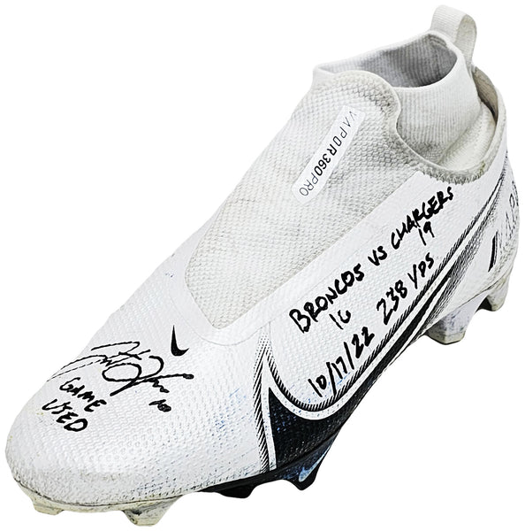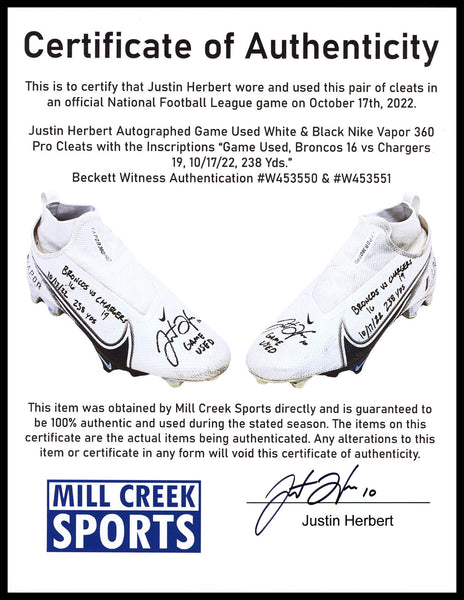 This is a Pair Of Game Used White & Black Nike Vapor 360 Pro Cleats that have been hand signed by Justin Herbert. This item was inscribed "Game Used, Broncos 16 vs Chargers 19, 10/17/22, 238 Yds." This item was obtained by Mill Creek Sports directly and is guaranteed to be 100% authentic and used during the stated season on the full page certificate of authenticity. The pair of game used cleats comes with this certificate that has been hand signed by Justin Herbert. This item has been witnessed and certified authentic by Beckett Authentication (BAS) and comes with their tamper-proof witness sticker. Beckett Authentication has recently changed their physical certificate card policy where they no longer match their tamper-proof sticker with a physical certificate. A certificate can be printed on Beckett's website for the matching authentication number.