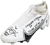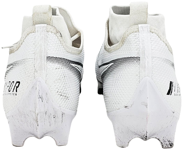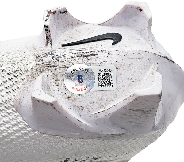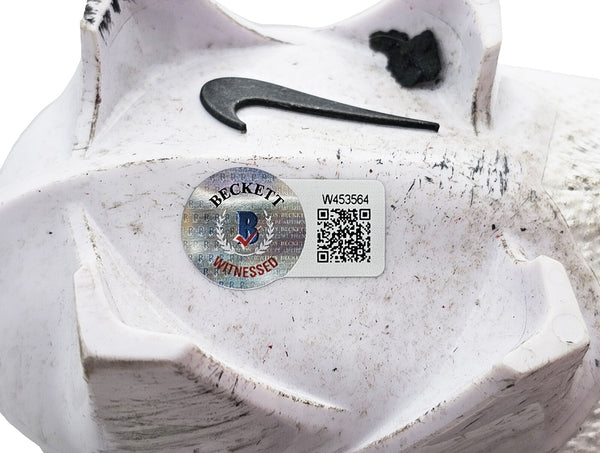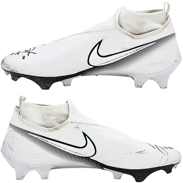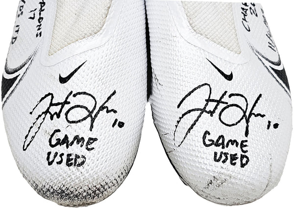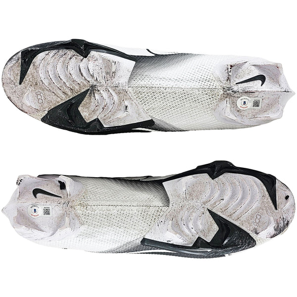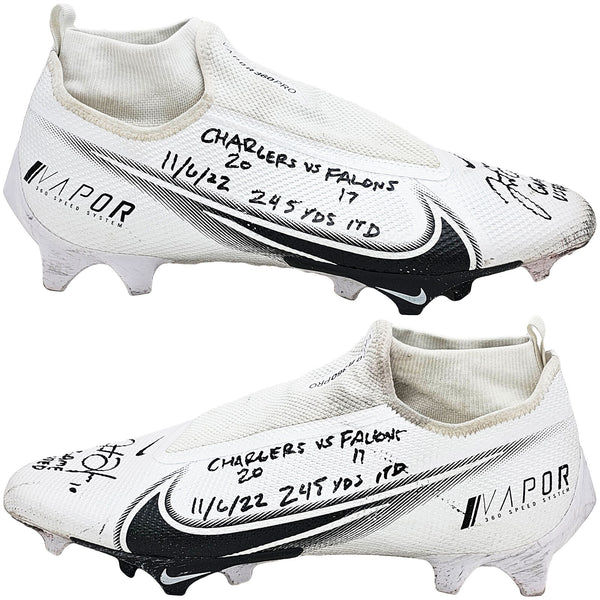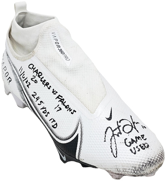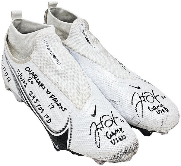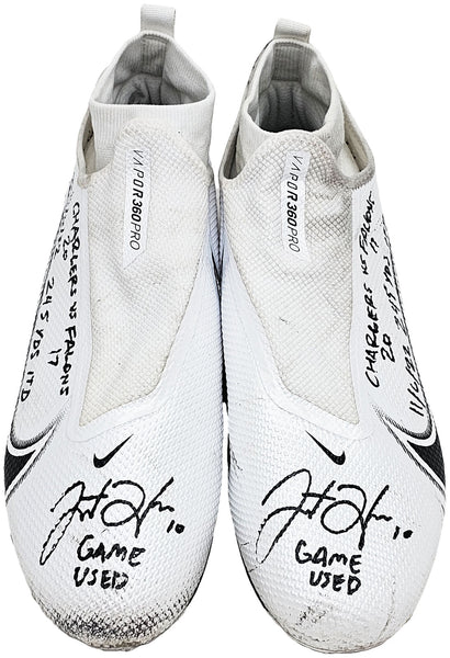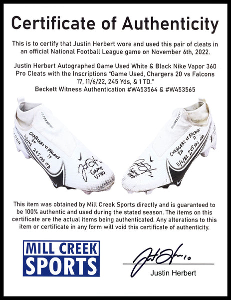 This is a Pair Of Game Used White & Black Nike Vapor 360 Pro Cleats that have been hand signed by Justin Herbert. This item was inscribed "Game Used, Chargers 20 vs Falcons 17, 11/6/22, 245 Yds, & 1 TD." This item was obtained by Mill Creek Sports directly and is guaranteed to be 100% authentic and used during the stated season on the full page certificate of authenticity. The pair of game used cleats comes with this certificate that has been hand signed by Justin Herbert. This item has been witnessed and certified authentic by Beckett Authentication (BAS) and comes with their tamper-proof witness sticker. Beckett Authentication has recently changed their physical certificate card policy where they no longer match their tamper-proof sticker with a physical certificate. A certificate can be printed on Beckett's website for the matching authentication number.