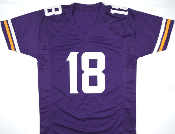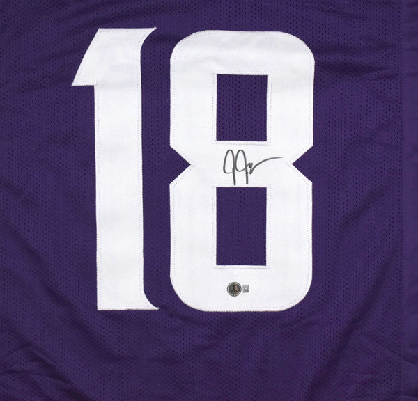 THIS IS NOT AN NFL JERSEY. THIS HAS NO TAGS, NO LOGOS, NO EMBLEMS. This is a hand autograph of Justin Jefferson of the Minnesota Vikings on a Custom Made (non-name brand) Authentic Style Jersey with stitched letters and numbers. This item has a Beckett Witnessed Authentication, which comes with a Beckett numbered sticker hologram and a QR Code for verification. You can view this item on the Beckett Authentication website. It was signed either at a public autograph appearance or a private signing. This is a stock photo of the item. Although you may not receive this exact item, the item you receive is virtually identical and brand new in great shape. Jersey size is XL. THIS IS NOT AN NFL JERSEY. THIS HAS NO TAGS, NO LOGOS, NO EMBLEMS. This is a hand autograph of Justin Jefferson of the Minnesota Vikings on a Custom Made (non-name brand) Authentic Style Jersey with stitched letters and numbers. This item has a Beckett Witnessed Authentication, which comes with a Beckett numbered sticker hologram and a QR Code for verification. You can view this item on the Beckett Authentication website. It was signed either at a public autograph appearance or a private signing. This is a stock photo of the item. Although you may not receive this exact item, the item you receive is virtually identical and brand new in great shape. Jersey size is XL.