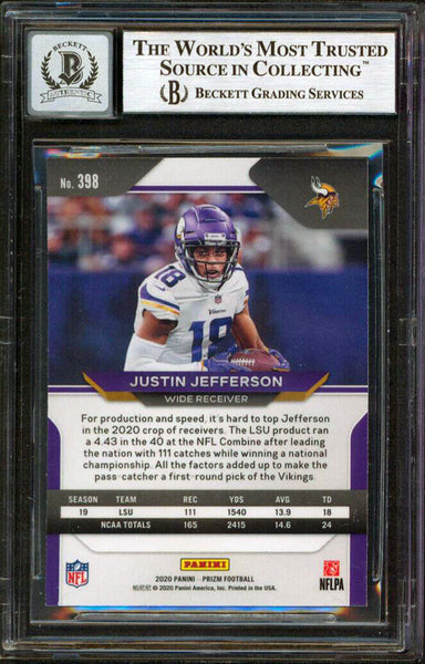 This Autographed Auto Graded Gem Mint 10! 2020 Panini Prizm #398A Rookie Card has been Personally Signed by Justin Jefferson of the Minnesota Vikings. This item is 100% Authentic, it comes slabbed and authenticated by Beckett Authentication Services. This is a stock item. We conducted an autograph signing with Justin Jefferson and we have several of these available. The one you will receive will be of equal quality to the one pictured. This item can be verified through BAS Slabbed.