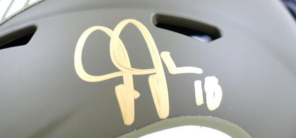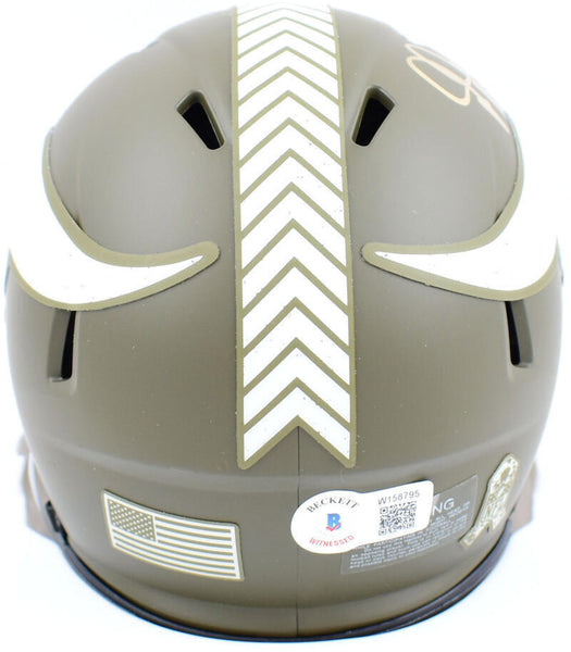 Justin Jefferson Autographed Vikings Salute to Service Speed Mini Helmet-Beckett W Hologram *Purple This is a hand autograph of Justin Jefferson of the Minnesota Vikings on a Riddell Football Salute to Service Speed Mini Helmet. This item has a Beckett Witnessed Authentication, which comes with a numbered sticker hologram and a QR code for verification. You can view this item on the Beckett Witnessed Authentication website and it shows when and where the item was signed. It was signed either at a public autograph appearance or a private signing. This is a stock photo of the item. Although you may not receive this exact item, the item you receive is virtually identical and brand new in great shape.