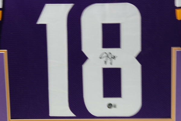 JUSTIN JEFFERSON AUTOGRAPHED & PROFESSIONALLY FRAMED PRO-STYLE JERSEY(Occasionally our own stock pictures are used at times due to quantity of framing, all frames will look identical as the one pictured)THE FRAMED JERSEY MEASURES 35"x 44" & COMES WITH THE FOLLOWING:-UV Protected Acrylic-Triple Acid Free Team Colored Matting-2 High Quality 8"x10" Photos-Team LogoEvery framed autographed jersey is accompanied with a tamper-proof hologram on the signed part of the jersey from one of the main authenticators in the industry (JSA, Beckett, PSA, etc.) and can be verified on their corresponding websites to prove authenticity.
