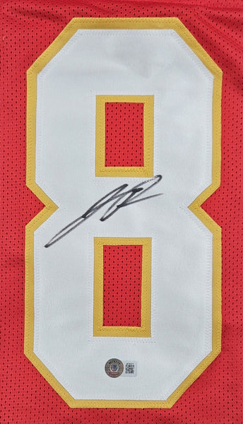 Featured is a Justyn Ross signed custom football jersey. This jersey has been hand signed by Ross and comes with the Beckett hologram and certificate of authenticity. This jersey features professionally sewn letters and numbers and is size XL. This jersey has no team tags or emblems and is intended as a sports collectible. This jersey would make a great addition to any sports memorabilia collection. SPECIFICATIONS Autographed By: Justyn Ross Team: Kansas City Chiefs Sport: Football Authentication: Beckett Grading Services