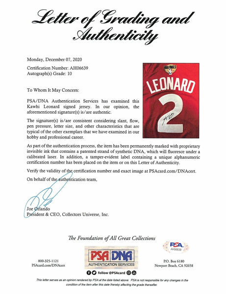 Extremely rare stitched jersey autographed by 2019 NBA Champion and 2x NBA Finals MVP, Kawhi Leonard, who led the Toronto Raptors to their first NBA Title in franchise history. Be the first to own this extremely rare Kawhi signed Raptors jersey! The autograph of Kawhi on this custom framed jersey was authenticated and graded a 10 by a team of experts at PSA/DNA so you can rest assured you are purchasing the real deal. This rare jersey also comes with a Letter of Authenticity from PSA/DNA.