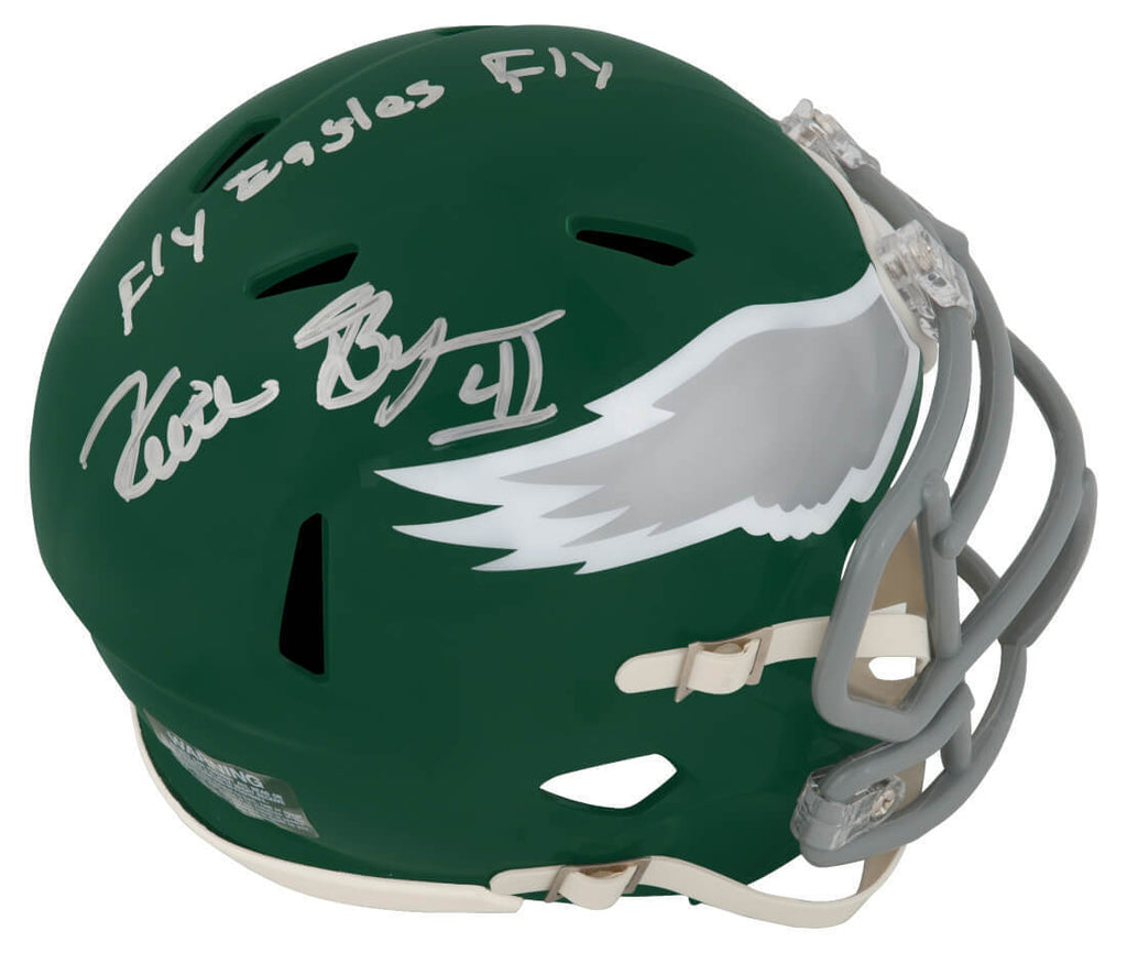 Keith Byars signed Philadelphia Eagles throwback Riddell speed mini helmet with 'Fly Eagles Fly' inscription. Item comes with a Schwartz Sports Memorabilia tamper-proof numbered hologram and Certificate of Authenticity which can be verified online.