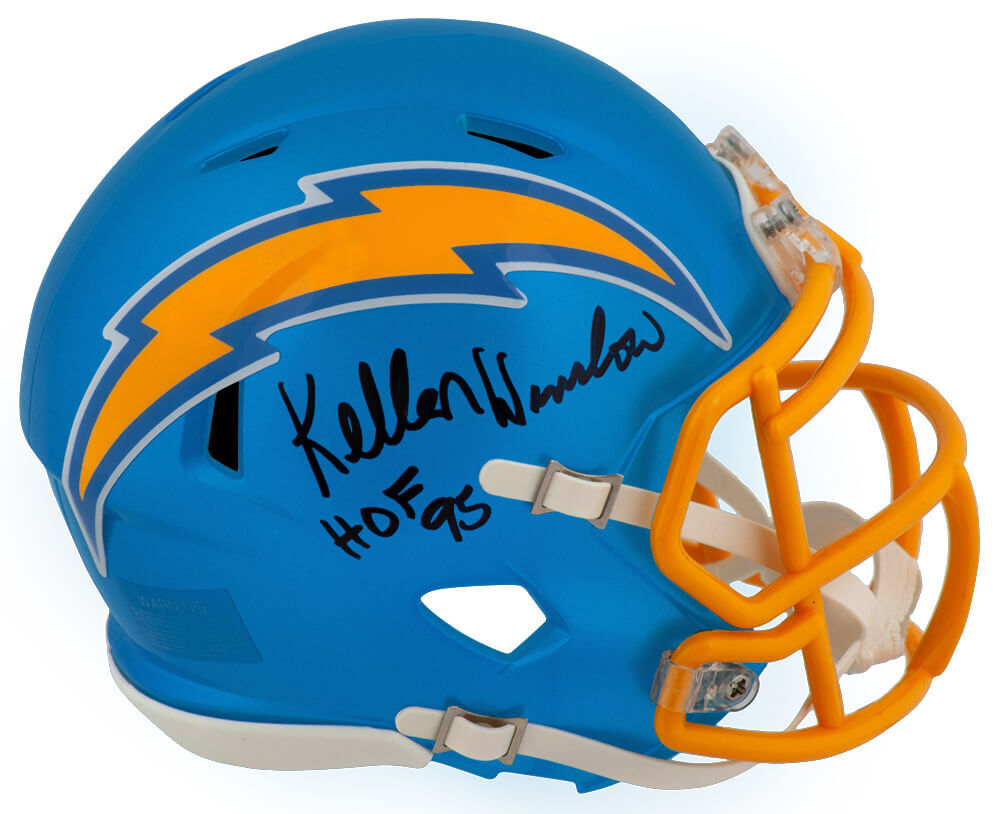 Kellen Winslow signed Chargers Flash Riddell speed mini helmet with 'HOF 95' inscription. Item comes with a Schwartz Sports Memorabilia tamper-proof numbered hologram and Certificate of Authenticity which can be verified online.