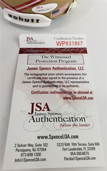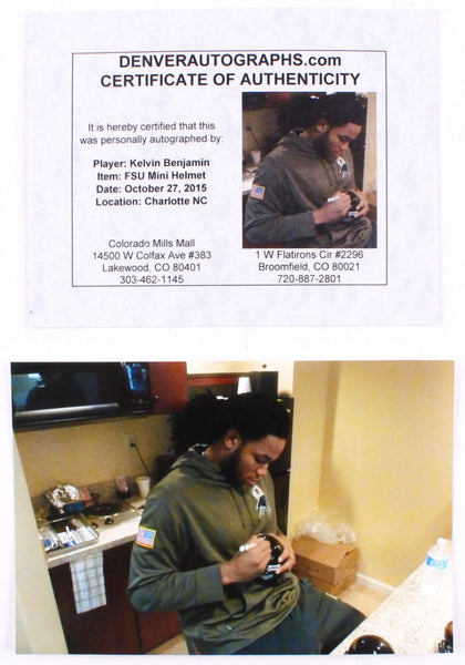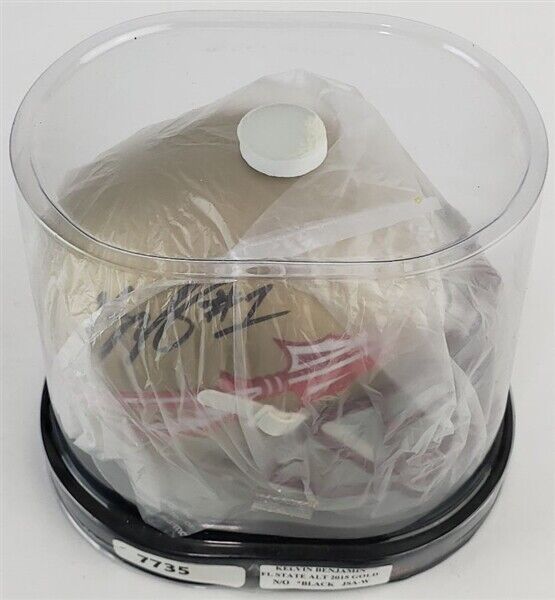 Schutt Florida State Seminoles mini helmet. Hand-signed and inscribed in white paint pen by Kelvin Benjamin (Bills). The lot / autograph(s) includes an official James Spence Authentication (JSA) hologram and matching COA for authenticity purposes. The signing of this item was witnessed by JSA. Also comes with a proof picture from the signing.Authentication: JSA COA