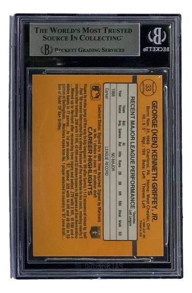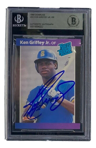 Featured is a Ken Griffey Jr. signed Seattle Mariners 1989 Donruss #33 Rookie card. This card has been hand signed Seattle Mariners by Griffey and has been slabbed and authenticated by Beckett. This card would make a great addition to any sports memorabilia collection!. SPECIFICATIONS Autographed By: Ken Griffey Jr. Team: Seattle Mariners Sport: Baseball Authentication: Beckett Grading Services