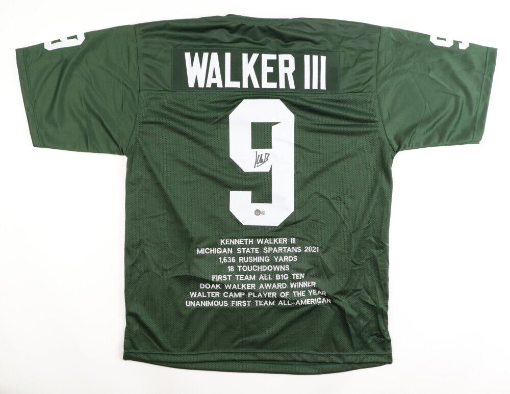 Custom on-field style jersey. Everything is sewn on, size XL. Hand-signed by Kenneth Walker III.The lot / autograph(s) includes an official Beckett Authentication Services serially-numbered hologram for authenticity purposes. The signing of this item was witnessed by Beckett.Authentication: Beckett HologramCustom on-field style jerseys are a more affordable option for autograph seekers. These jerseys do not have any brand name or tags and are made in the Philippines. They feature stitched on names and numbers and are made to look very similar to the on-field jerseys that the players wear. These custom jerseys are very commonly used in the memorabilia industry.