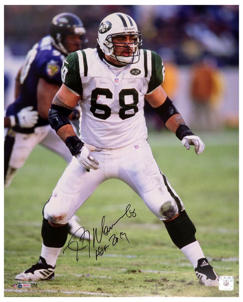 Kevin Mawae signed New York Jets action 16x20 photo with 'HOF 2019' inscription. Item comes with a Schwartz Sports Memorabilia tamper-proof numbered hologram and Certificate of Authenticity which can be verified online.