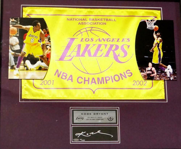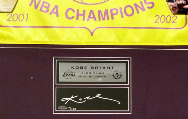 Kobe Bryant 6/100 Signed LA Lakers Framed 2001/02 NBA Champions Flag- UDA Auth This is a Hand Autographed Framed Los Angeles Lakers NBA Champions Flag of Kobe Bryant. This item has a Upper Deck Authentication, which comes with a #'ed Sticker. You can view this item on the UPA website, it shows when and where the item was signed. It was signed either at a public autograph appearance or a private signing. This is the exact item you will receive.