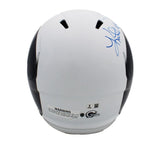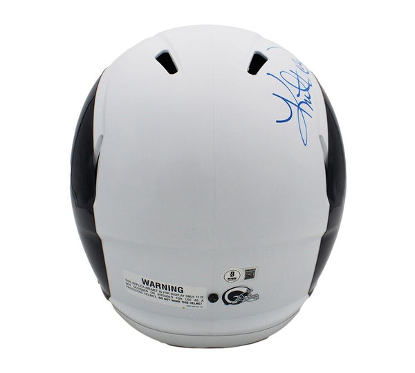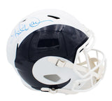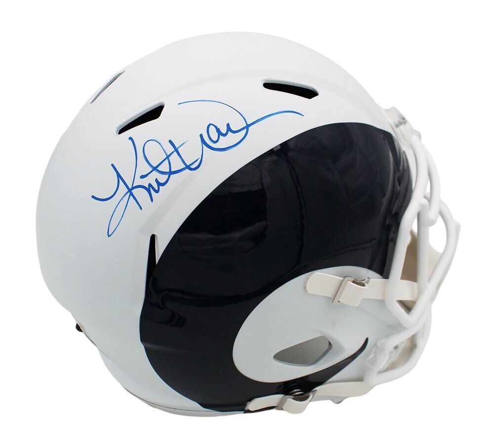 A Los Angeles Rams Speed Replica AMP NFL Helmet hand signed by Kurt Warner. The item and signature are in excellent condition. Kurt played in the NFL as a quarterback and was a Super Bowl Champion and MVP (XXXIV). He was also a 2x NFL Most Valuable player (1999, 2001), a 4x Pro Bowl Player (1999-2001,2008), and was named Walter Peyton Man of the Year in 2008. AUTHENTICATION: The item is accompanied by a Beckett Serial Numbered & Databased Hologram