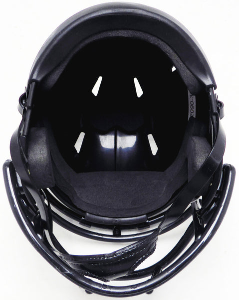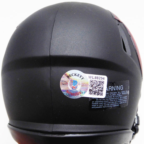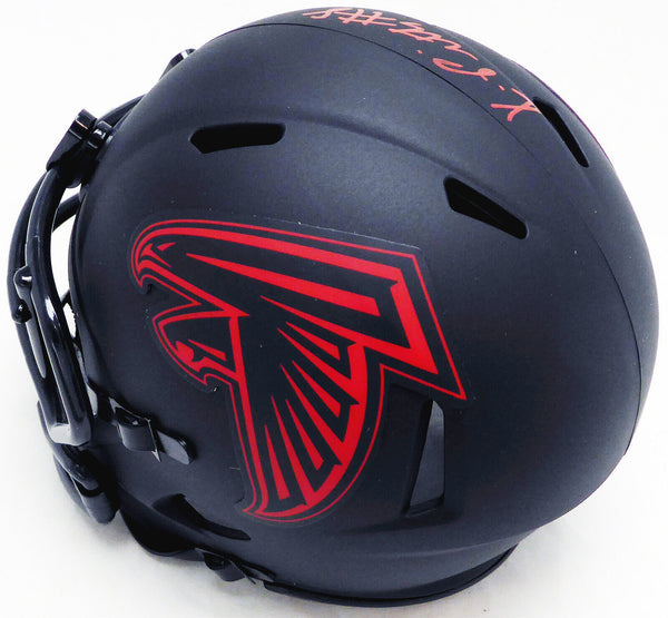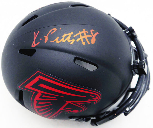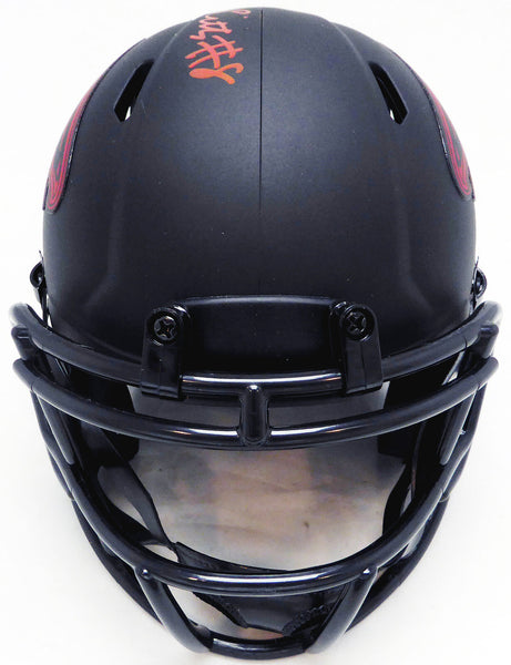 This is an Atlanta Falcons Eclipse Black Speed Mini Helmet that has been hand signed by Kyle Pitts. The Eclipse helmets are very delicate and often have some marks or scratches on them. This item has been witnessed and certified authentic by Beckett Authentication (BAS) and comes with their tamper-proof witness hologram.