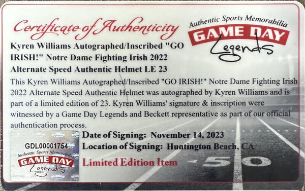 This notre dame fighting irish alternate authentic speed helmet has been personally hand-signed by super sports center exclusive athlete, kyren williams. kyren added the inscription "go irish." it comes with an individually numbered, tamper-evident hologram from beckett authentic. to ensure authenticity, the hologram can be reviewed online. this process helps to ensure that the product purchased is authentic and eliminates any possibility of duplication or fraud. also included is the super sports center tamper-evident hologram and certificate of authenticity.this helmet is limited to just 23 and you are bidding on a random number from the edition. kyren williams is the newest exclusive athlete to the super sports center family.