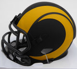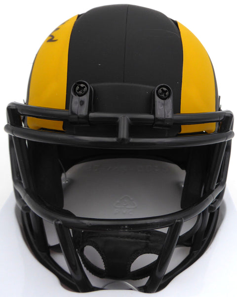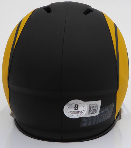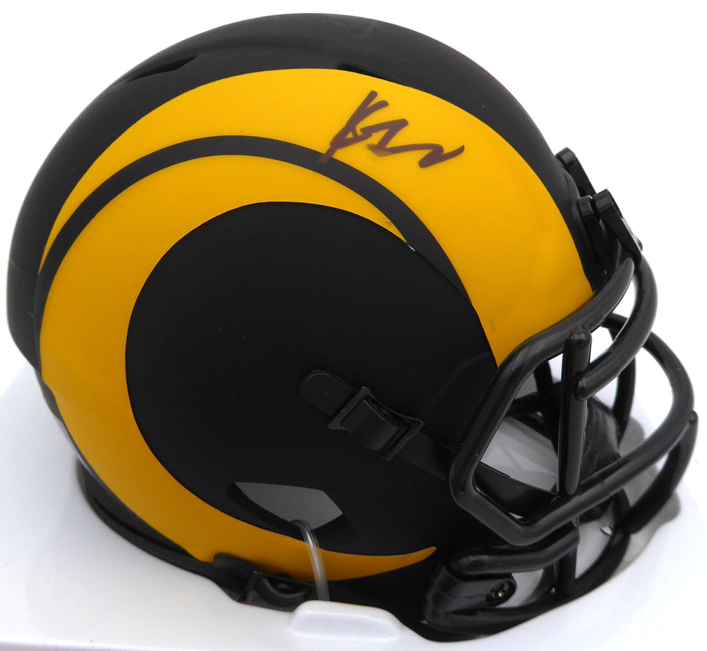 This is a Los Angeles Rams Eclipse Black Mini Helmet that has been hand signed by Kyren Williams. The Eclipse helmets are very delicate and often have some marks or scratches on them. There is a smudge in the signature as shown. This item has been certified authentic by Beckett Authentication (BAS) and comes with their tamper-proof QR Code sticker that can be verified on the Beckett-authentication.com.