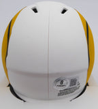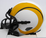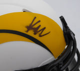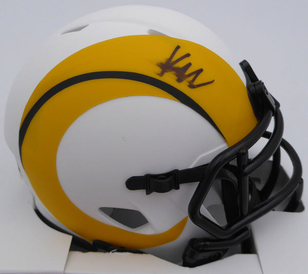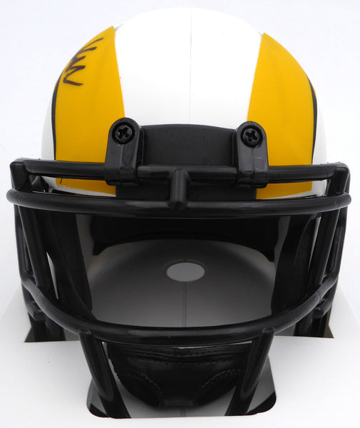 This is a Los Angeles Rams Lunar Eclipse Mini Helmet that has been hand signed by Kyren Williams. There is a smudge in the signature as shown. This item has been certified authentic by Beckett Authentication (BAS) and comes with their tamper-proof QR Code sticker that can be verified on the Beckett-authentication.com.