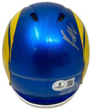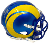 Riddell Los Angeles Rams speed mini helmet. Hand-signed by Kyren Williams.The autograph includes an official Beckett Authentication Services serially numbered hologram for authenticity purposes. The signing of this item was witnessed by Beckett.Authentication: Beckett Hologram