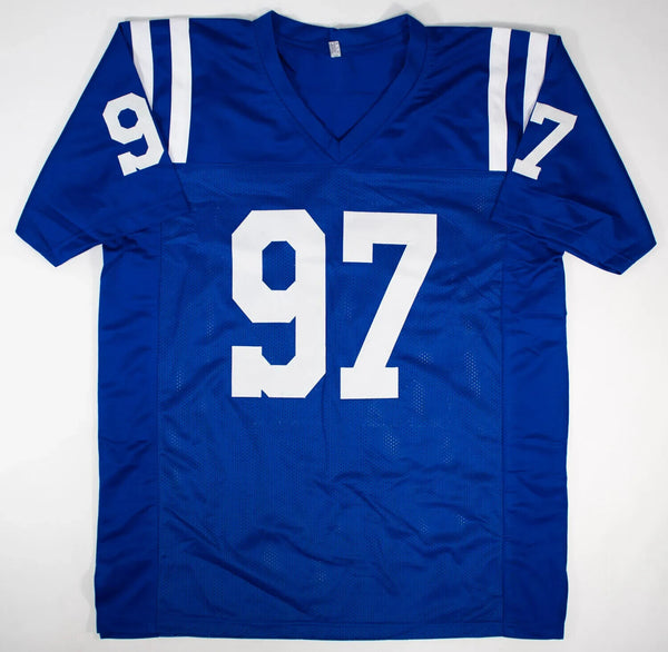 Custom on-field style jersey. Everything sewn on, size XL. Hand-signed in black felt tip pen by Laiatu Latu. This autograph is certified by James Spence Authentication (JSA). It comes with the numbered hologram and matching Certificate of Authenticity.Custom on-field style jerseys are a more affordable option for autograph seekers. These jerseys do not have any brand name or tags and are made in the Philippines. They feature stitched on names and numbers and are made to look very similar to the on-field jerseys that the players wear. These custom jerseys are very commonly used in the memorabilia industry.