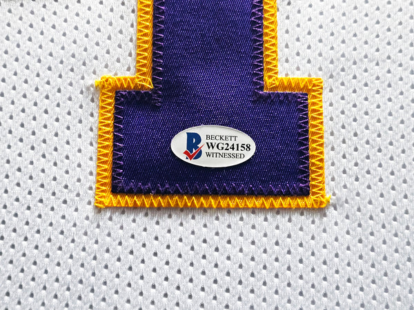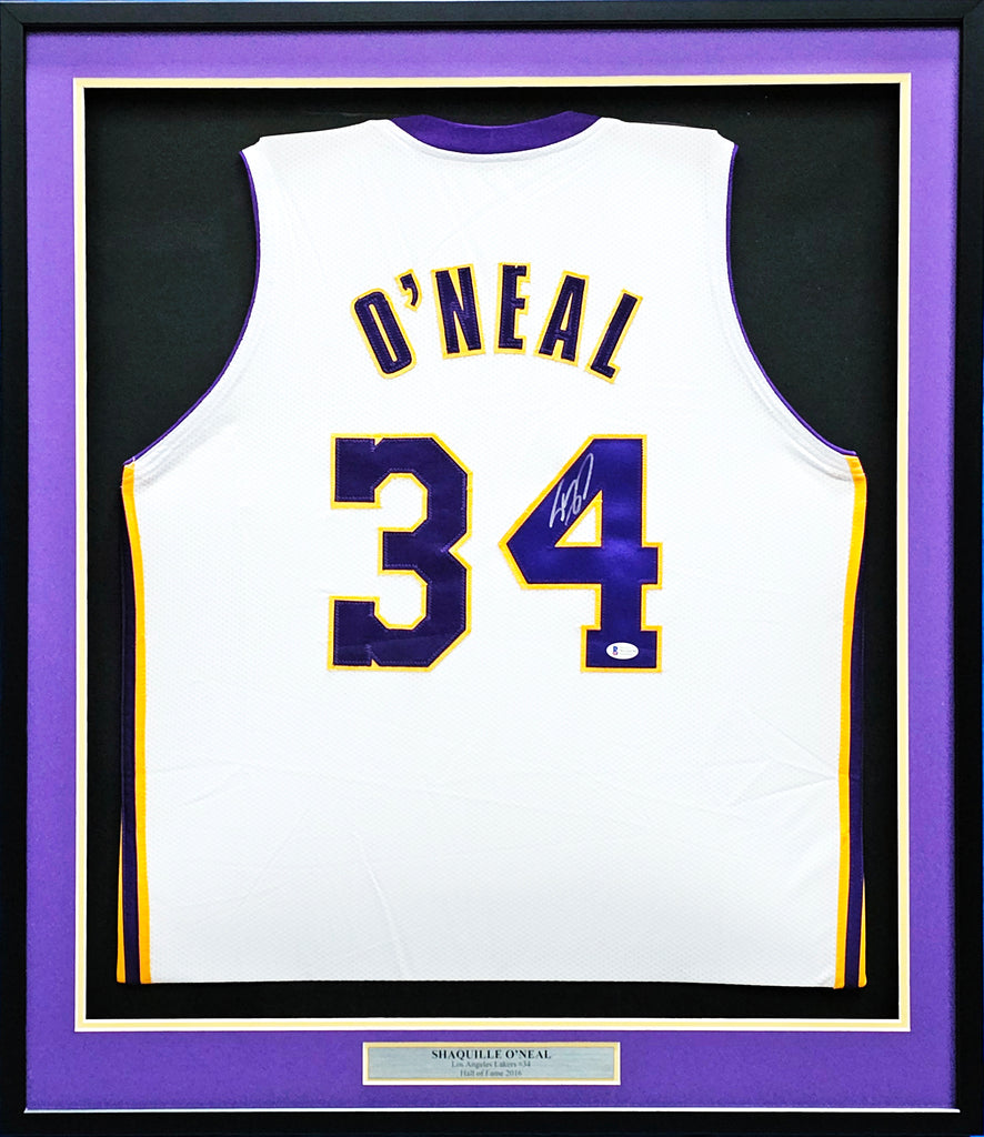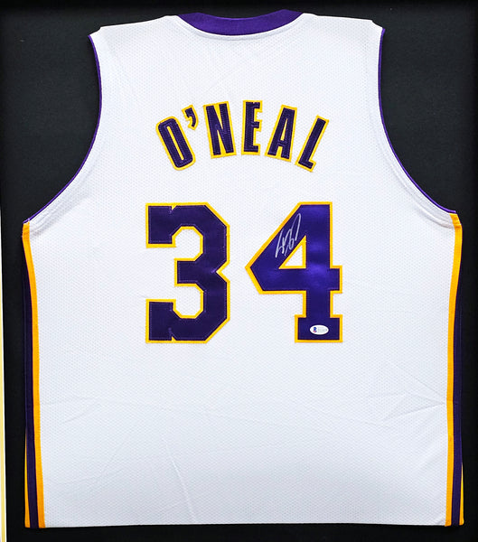 This is a framed White Jersey, approximately 31x36 with the frame, that has been hand signed by Shaquille O'Neal. This is a custom jersey with no name brand. The approximate size is XL. It has nice sewn in name and numbers.A This item has been witnessed and certified authentic by Beckett Authentication (BAS) and comes with their tamper-proof witness sticker. Beckett Authentication has recently changed their physical certificate card policy where they no longer match their tamper-proof sticker with a physical certificate. A certificate can be printed on Beckett's website for the matching authentication number.