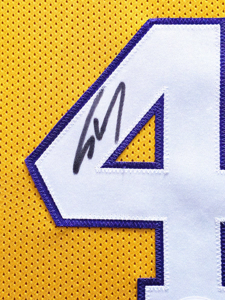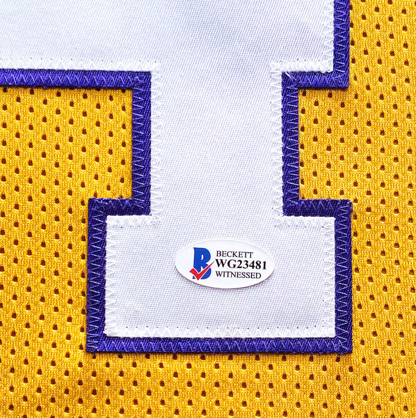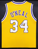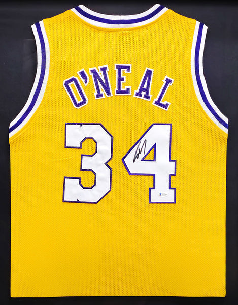 This is a Framed Yellow Jersey, approximately 31x36 with the frame, that has been hand signed by Shaquille O'Neal. This is a custom jersey with no name brand. The approximate size is XL. It has nice sewn in name and numbers. This item has been certified authentic by Beckett Authentication (BAS) and comes with their tamper-proof sticker.
