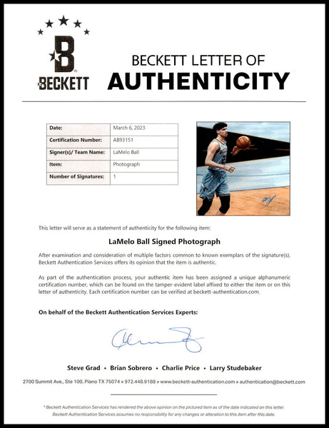 This is a 16x20 Photo that has been hand signed by LaMelo Ball. This item has been certified authentic by Beckett Authentication (BAS) and comes with their tamper-proof sticker. Beckett Authentication has recently changed their physical certificate card policy where they no longer match their tamper-proof sticker with a physical certificate. If the item features a Beckett Authenticated QR Code, the item does NOT come with a matching certificate. A certificate can be printed on Beckett's website for the matching authentication number.