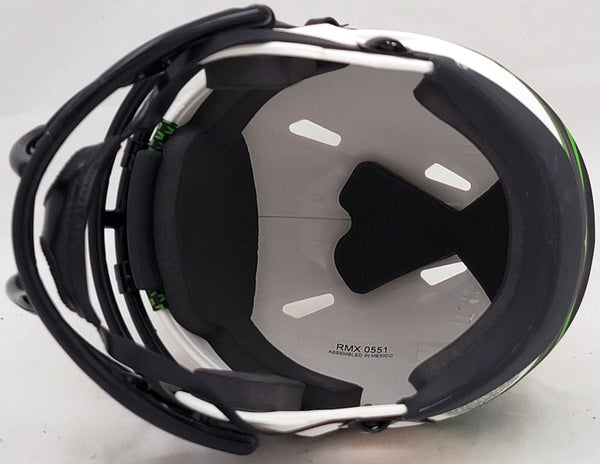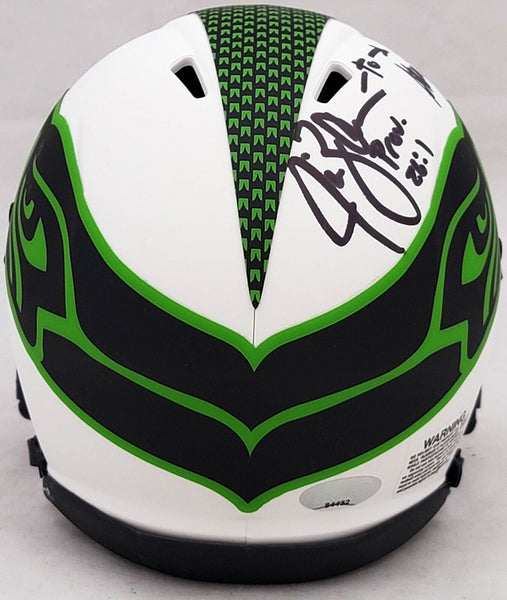 This is a Seattle Seahawks Lunar Eclipse White Speed Mini Helmet that has been hand signed by Steve Largent & Jim Zorn. The Eclipse helmets are delicate and may have some marks or scratches on them. This item was signed in the presence of a Mill Creek Sports representative and comes with their serial numbered hologram and matching certificate of authenticity.