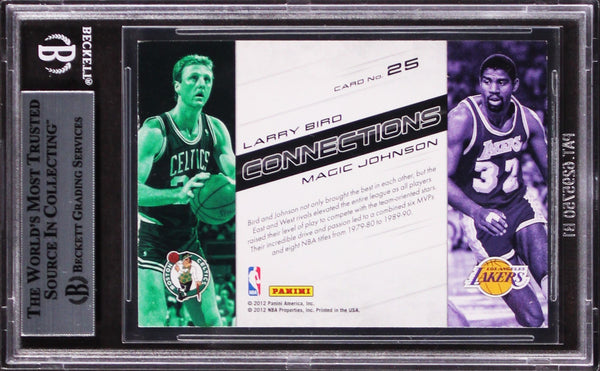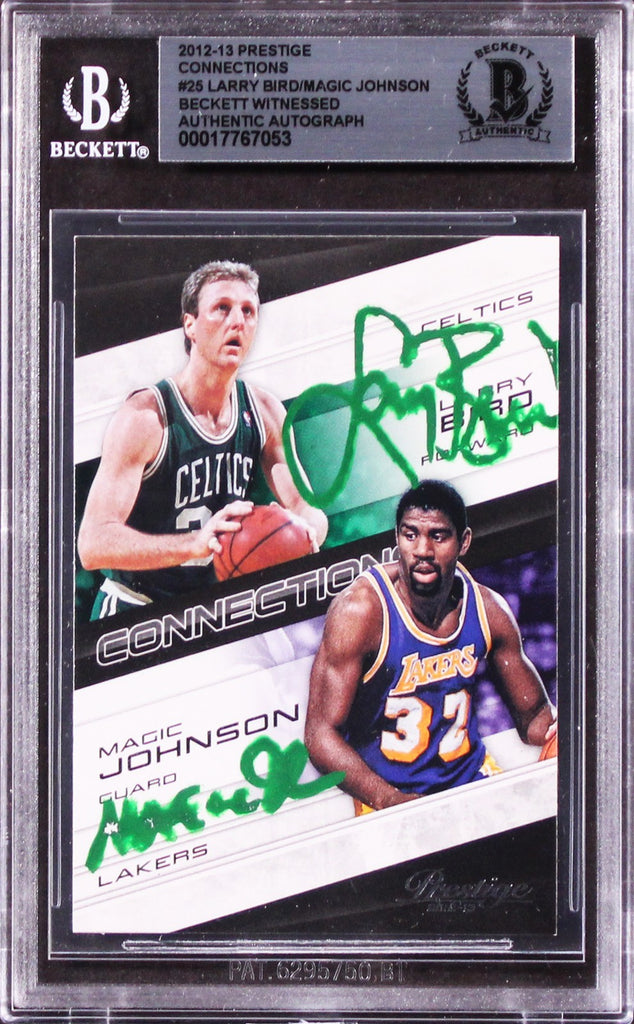 This Autographed 2012 Prestige Connections #25 Card has been Personally Signed by Larry Bird & Magic Johnson. This item is 100% Authentic, it comes slabbed and authenticated by Beckett Authentication Services. The authenticity can be verified on Beckett Authentication Services website.