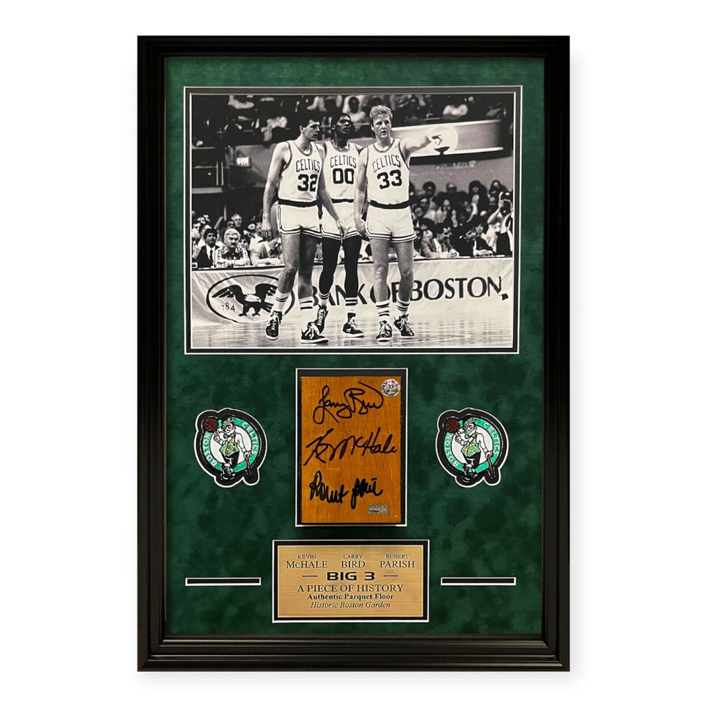 This parquet floor piece framed to 16x24 has been personally hand-signed by Larry Bird, Robert Parrish & Kevin Mchale of the Boston Celtics.100% Authentic. Certificate of Authenticity by New England Picture & has Larry Birds official player hologram Exact location of signature and parquet piece may vary asgmemorabilia.com