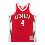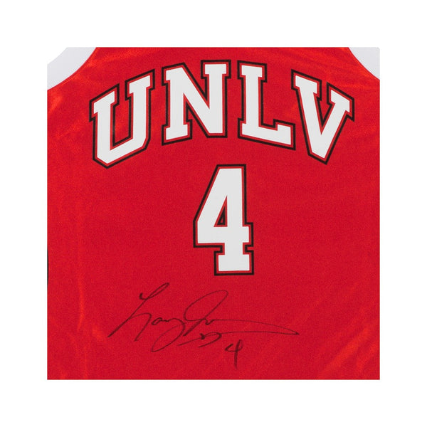 Larry Johnson spent just two seasons on the campus of the University of Nevada, Las Vegas, but he left an indelible mark on the program and college basketball as a whole. After transferring from Odessa College (Tx.), he teamed with Stacey Augmon, Greg Anthony and Anderson Hunt to lead the Runnin' Rebels to the NCAA title under head coach Jerry Tarkanian. UNLV brought an up-tempo game mixed with a tough swagger to become one of the most popular champions in history. They came up short in the Final Four the following season after a perfect regular season, but that doesn't tarnish the effect Johnson and crew had on the game of college basketball. He has signed the front of this jersey, which also features a UNLV patch and a patch honoring the season (1989-90) in which the Runnin' Rebels wore this jersey. Johnson has autographed this limited edition (25) authentic Mitchell & Ness red UNLV jersey in black paint pen. His signature is deemed authentic by virtue of Upper Deck Authenticated's Five Step Process.