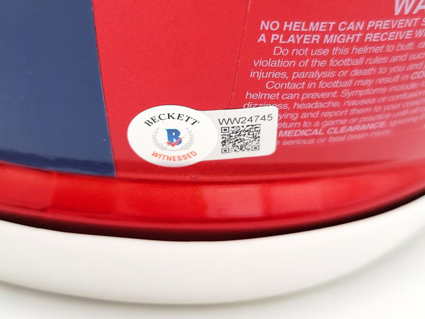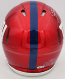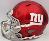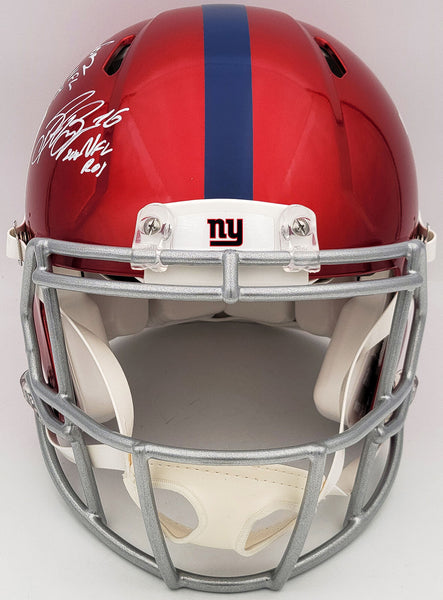 This is a New York Giants Flash Red Full Size Authentic Speed Helmet that has been hand signed by Lawrence Taylor & Saquon Barkley. The Flash helmets are delicate and often have some marks or scratches on them. Taylor inscribed this item "81 NFL ROY." Barkley inscribed this item "2018 NFL ROY." This item has been certified authentic by Beckett Authentication (BAS) and comes with their tamper-proof QR Code sticker that can be verified on the Beckett-authentication.com.