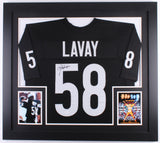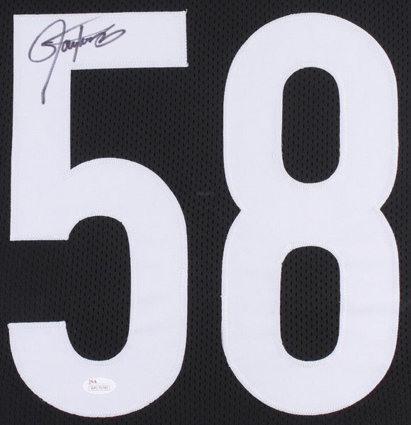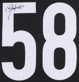 Custom frame measures approximately 31" x 35" in size and features a jersey which has been hand-signed in black felt-tip pen by Lawrence Taylor (HOF). The autograph includes an official James Spence Authentication (JSA) hologram and matching COA for authenticity purposes. The signing of this item was witnessed by JSA.Authentication: JSA COA