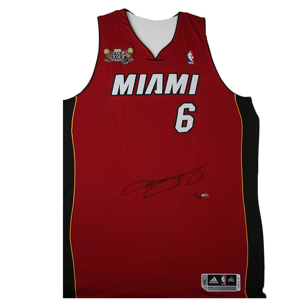 When the Miami Heat set out to defend their championship in 2013, they had the spotlight on them. Sixty-six wins in the regular season only increased the pressure they put on themselves. When it comes to pressure, few in the history of the game are better than LeBron James. He captured regular season and NBA Finals MVP honors in leading the Heat to victory over the Spurs in seven games. In doing so, the Heat became just the sixth organization in the history of the NBA to repeat as champions, joining the list of the Lakers, Celtics, Pistons, Bulls and Rockets. James has autographed this jersey on the front to showcase the uniquely designed patch. The patch highlights the Heat winning back-to-back championships in 2013. James has signed this limited edition (25) Miami Heat red jersey in black paint pen. His signature is deemed authentic by virtue of Upper Deck Authenticated's Five Step Process.