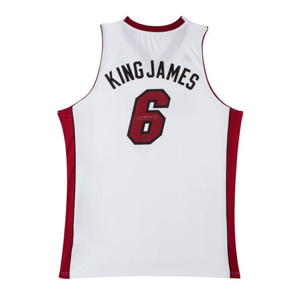 The Miami Heat has several players on their roster that are known around the league by a nickname. These players include Chris "Birdman" Anderson, Ray "Jesus Shuttlesworth" Allen, and Norris "Cole Train" Cole to name a few. The Heats best player, LeBron James has gone by the nickname "King James" for close to a decade now. The NBA and the Miami Heat introduced a new alternative nickname uniform during the 2013-14 NBA season. James has signed this Swingman Adidas No. 6 Miami Heat "King James" nickname jersey in silver paint pen. His signature is deemed 100% authentic by virtue of Upper Deck Authenticated's Five-Step Process.