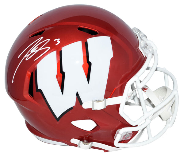 Lee Evans, former All-American wide receiver for the Badgers, has hand signed this Wisconsin Riddell Speed Flash full-size replica helmet at a private signing. This item is authenticated by Beckett Authentication Services, one of the top authenticators in the industry. Their tamper-evident hologram featuring a QR code and serial number is on the item. The authenticity can be verified online by entering the serial number or scanning the QR code.Item pictured may not be the exact item you will receive. It will be similar quality, and we guarantee your satisfaction.