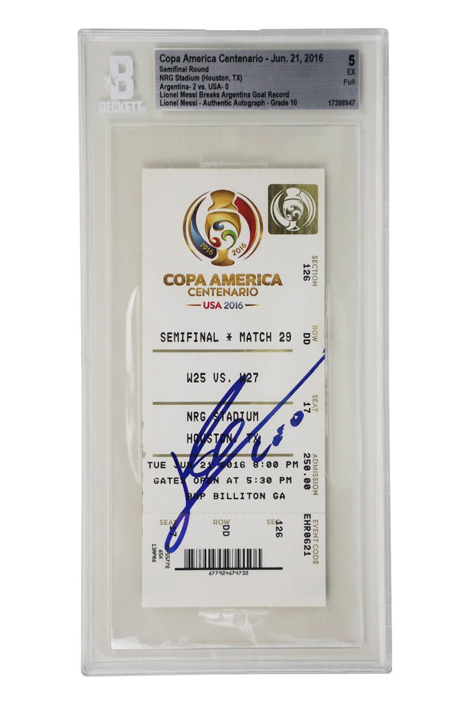 This is a Lionel Messi Signed 2016 Breaks Argentina Goal Record vs USA Game Ticket - BGS 5. THE ITEM IN THE PICTURE IS A STOCK IMAGE. YOU WILL RECEIVE AN IDENTICAL ITEM OF EQUAL QUALITY. ALL JERSEYS ARE SIZE LARGE. Every item of signed memorabilia we sell is official and of the highest quality. We pride ourselves on providing sports fans with the most exclusive signed memorabilia on the market. We are an industry leading signed memorabilia company who can guarantee 100% authenticity on every signature we sell. The item you receive will be identical to the one you are seeing in the stock pictures. This includes the item, the authentication company, signature color and signature placement. We take pride in ensuring the authenticity of all our items. With unwavering commitment, we guarantee that every signature is 100% authentic. Every item of signed memorabilia comes with a scannable barcode which takes you to the certificate of authenticity on the company's website. These industry leading authentication companies include Beckett Authentication Services, James Spencer Authentication Services and Professional Sports Authentication Services.
