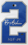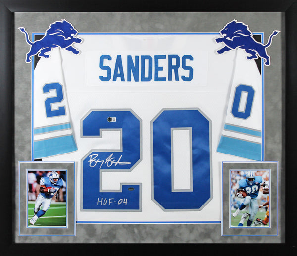 This Autographed White Mitchell & Ness Throwback Framed Jersey with the inscription of "HOF 04" has been Personally Signed by Barry Sanders of the Detroit Lions. This item is 100% Authentic to include a hologram by Beckett Authentication Services. This item will come with an affixed Beckett Authentication Services (BAS) authentication sticker, which includes a scannable QR code to verify authenticity. Please note that Beckett no longer provides serial-numbered COA cards, and the attached BAS sticker will serve as the complete authentication for this item. This is a BAS Witnessed Protection Program item which means a Beckett Authentication Service representative was present when this item was being signed. We conducted an autograph signing with Barry Sanders where multiples of the same item were signed. While the photographs are representative of this item, the size, placement and strength of the signature may vary. Each item is hand signed, therefore, each autograph is unique. This item can be verified through BAS Witnessed. This item has been professionally framed to overall dimensions of approximately 32 x 37 inches. This is a X-Large sized Framed Jersey. This jersey will be framed to order, it will take 3-4 days from purchase date for it to ship.