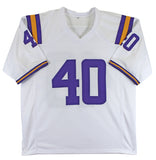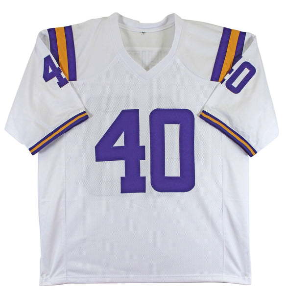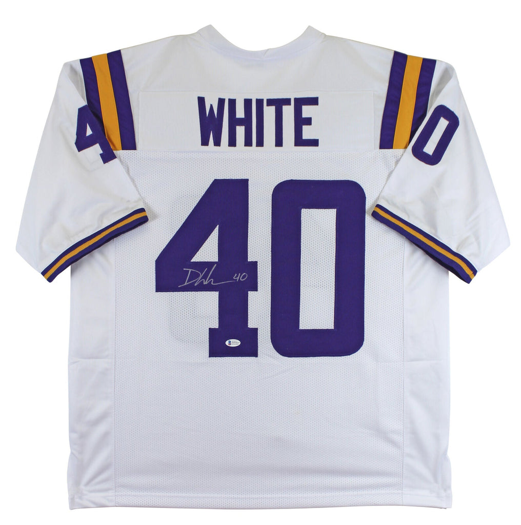 This Autographed White Pro Style Jersey has been Personally Signed by Devin White of the Louisiana State Tigers. This item is 100% Authentic to include a hologram by Beckett Authentication Services. This item will come with the new Beckett Authentication hologram that has a scannable QR code rather than the traditional COA. If you would like to have a COA, you are welcome to reach out to Beckett for a printed certification once you receive your item. This is a BAS Witnessed Protection Program item which means a Beckett Authentication Service representative was present when this item was being signed. We conducted an autograph signing with Devin White where multiples of the same item were signed. While the photographs are representative of this item, the size, placement and strength of the signature may vary. Each item is hand signed, therefore, each autograph is unique. This item can be verified through BAS Witnessed. This is a X-Large sized, non-branded, custom-stitched Jersey.
