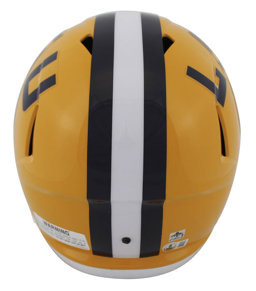 This Autographed Riddell Full Size Speed Rep Helmet W/ Uv Mirrored Back Acrylic Display Case has been Personally Signed by Ja'Marr Chase of the Louisiana State Tigers. This item is 100% Authentic to include a hologram by Beckett Authentication Services. This item will come with an affixed Beckett Authentication Services (BAS) authentication sticker, which includes a scannable QR code to verify authenticity. Please note that Beckett no longer provides serial-numbered COA cards, and the attached BAS sticker will serve as the complete authentication for this item. This is a BAS Witnessed Protection Program item which means a Beckett Authentication Service representative was present when this item was being signed. We conducted an autograph signing with Ja'Marr Chase where multiples of the same item were signed. While the photographs are representative of this item, the size, placement and strength of the signature may vary. Each item is hand signed, therefore, each autograph is unique. This item can be verified through BAS Witnessed.
