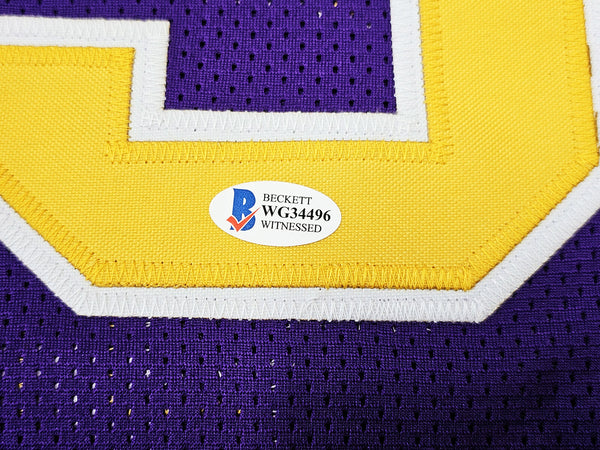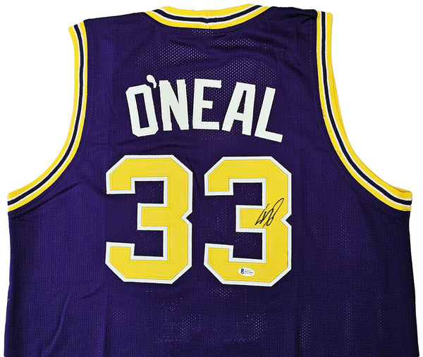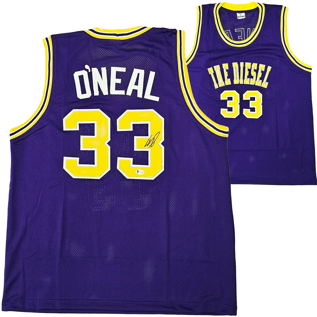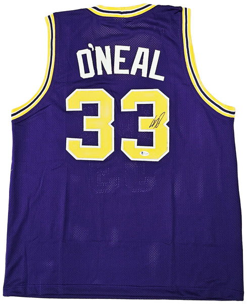 This is a Purple Jersey that has been hand signed by Shaquille Shaq O'Neal. This is a custom jersey with no name brand. The approximate size is XL. It has nice sewn in name and numbers. This item has been witnessed and certified authentic by Beckett Authentication (BAS) and comes with their tamper-proof witness sticker. Beckett Authentication has recently changed their physical certificate card policy where they no longer match their tamper-proof sticker with a physical certificate. A certificate can be printed on Beckett's website for the matching authentication number.